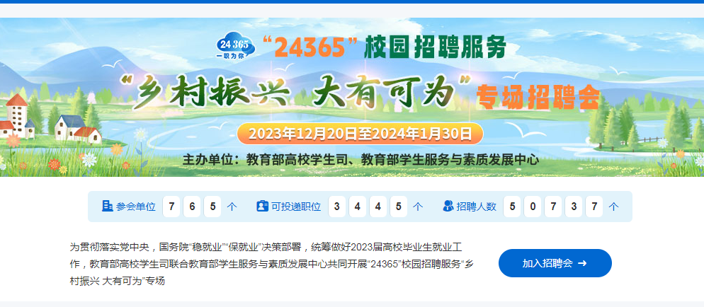 为贯彻落实党中央,国务院“稳就业”“保就业”决策部署,统筹做好2023届高校毕业生就业工作,教育部高校学生司联合教育部学生服务与素质发展中心共同开展“24365”校园招聘服务“乡村振兴大有可为”专场。