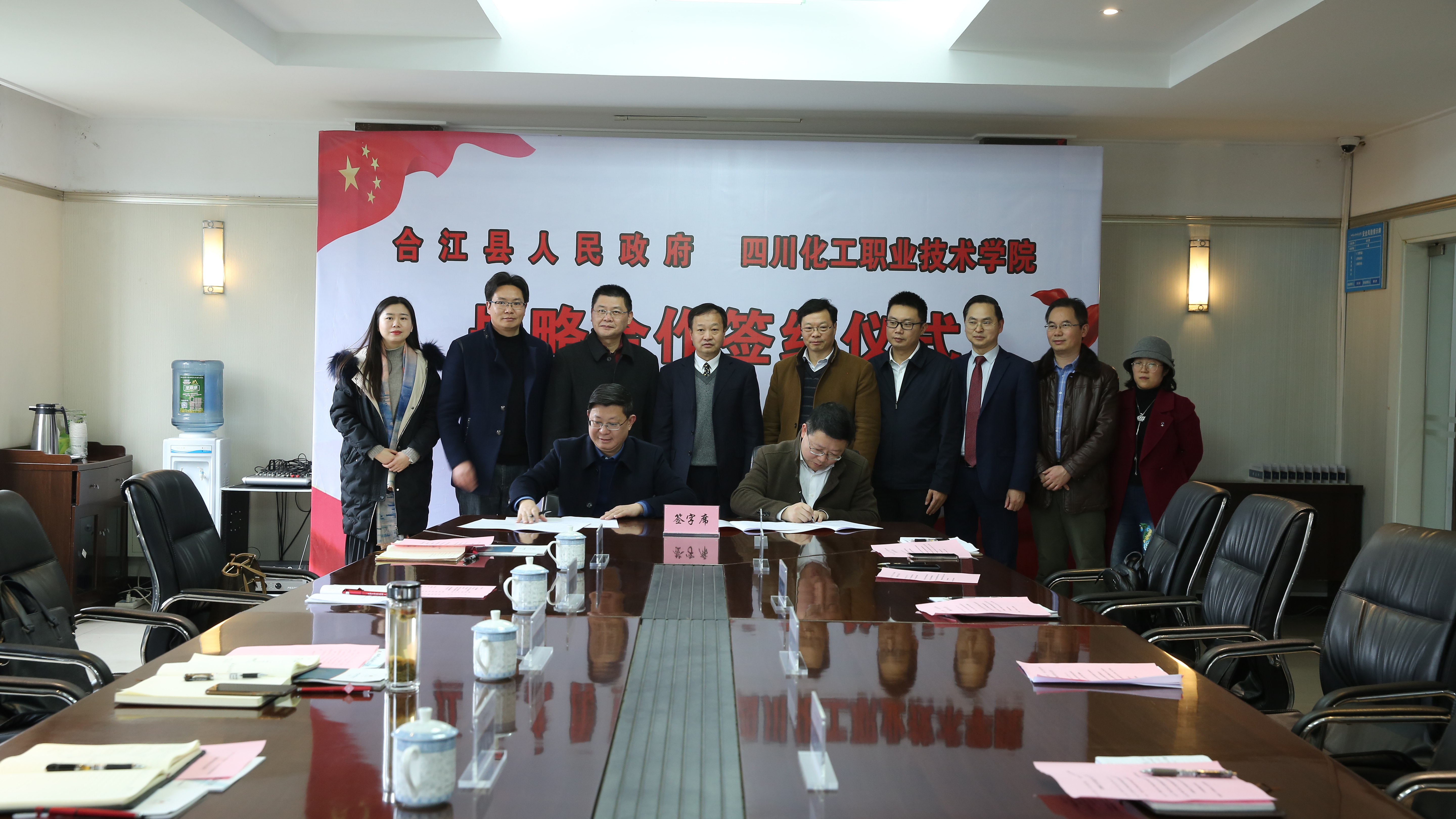 为深入贯彻党的十九大和习近平总书记系列重要讲话精神,落实《国家职业教育改革实施方案》相关要求,践行发展新理念,开辟发展新境界,充分发挥四川化工职业技术学院在教学、科研、人才培养、社会服务等方面的优势,构建学院与合江县战略合作机制,本着“紧密协作、优势互补、互相支持、共谋发展”的精神,按照“平等、互利、互惠”的原则,2020年1月13日下午,四川化工职业技术学院与合江县人民政府战略合作签约仪式在四川化工职业技术学院隆重举行。合江县人民政府黄智勇副县长、合江县临港工业园区管理委员会刘君达主任、刘英副主任、合江县教体局冯图局长、合江县经商科技局蒋永莲副局长、四川化工职业技术学院党委刘志勇书记、王志斌副院长、文申柳副院长、谢光杰院长助理及党办、院办、教务处、继续教育处、科技处、招生就业处(校企办)、各教学系部主要负责人参加了签约仪式。签约仪式由四川化工职业技术学院王志斌副院长主持。