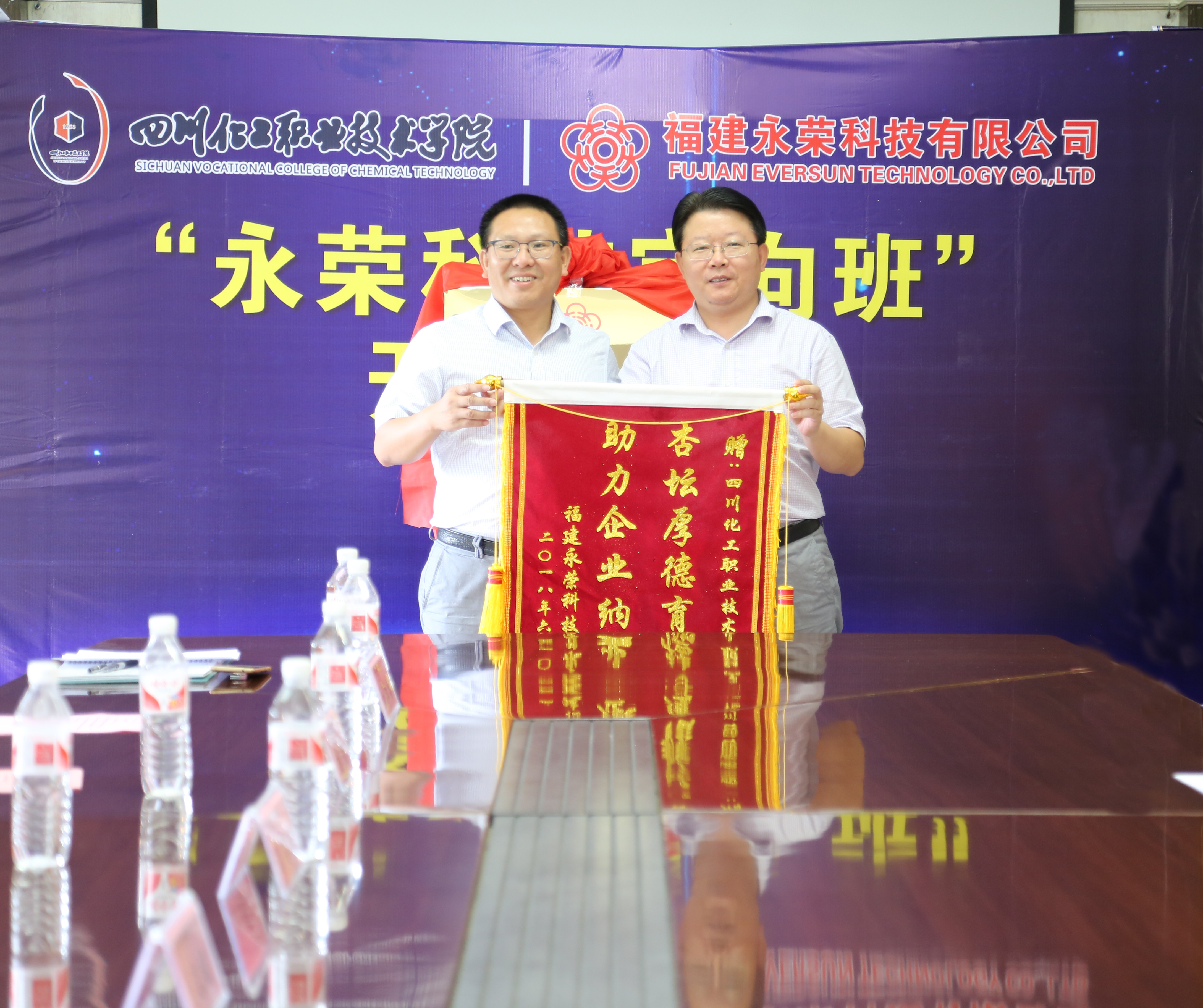 仪式最后,福建永荣科技有限公司副总经理刘期敏先生代表公司向文申柳副院长颁发了写着“杏坛厚德育栋梁,助力企业纳英才”的锦旗,表达了公司对学院为公司培养和输送了近200名高素质毕业生的感激之情。