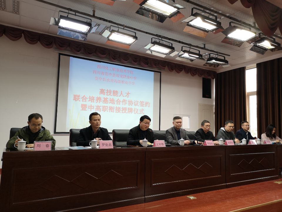 在这万物复苏、春暖花开的季节,乘着国务院颁布《国家职业教育改革实施方案》的东风,为进一步推进我院中高职衔接工作,加快高技能人才联合培养基地的建设步伐,2019年3月19日,学院文申柳副院长带领招生就业处罗伦忠处长、机械工程系高朝祥主任、自动化系电子专业负责人刘春老师、信息工程系计算机专业负责人程明老师一行前往四川省资中职业技术学校举行高技能人才联合培养基地签约及授牌仪式。