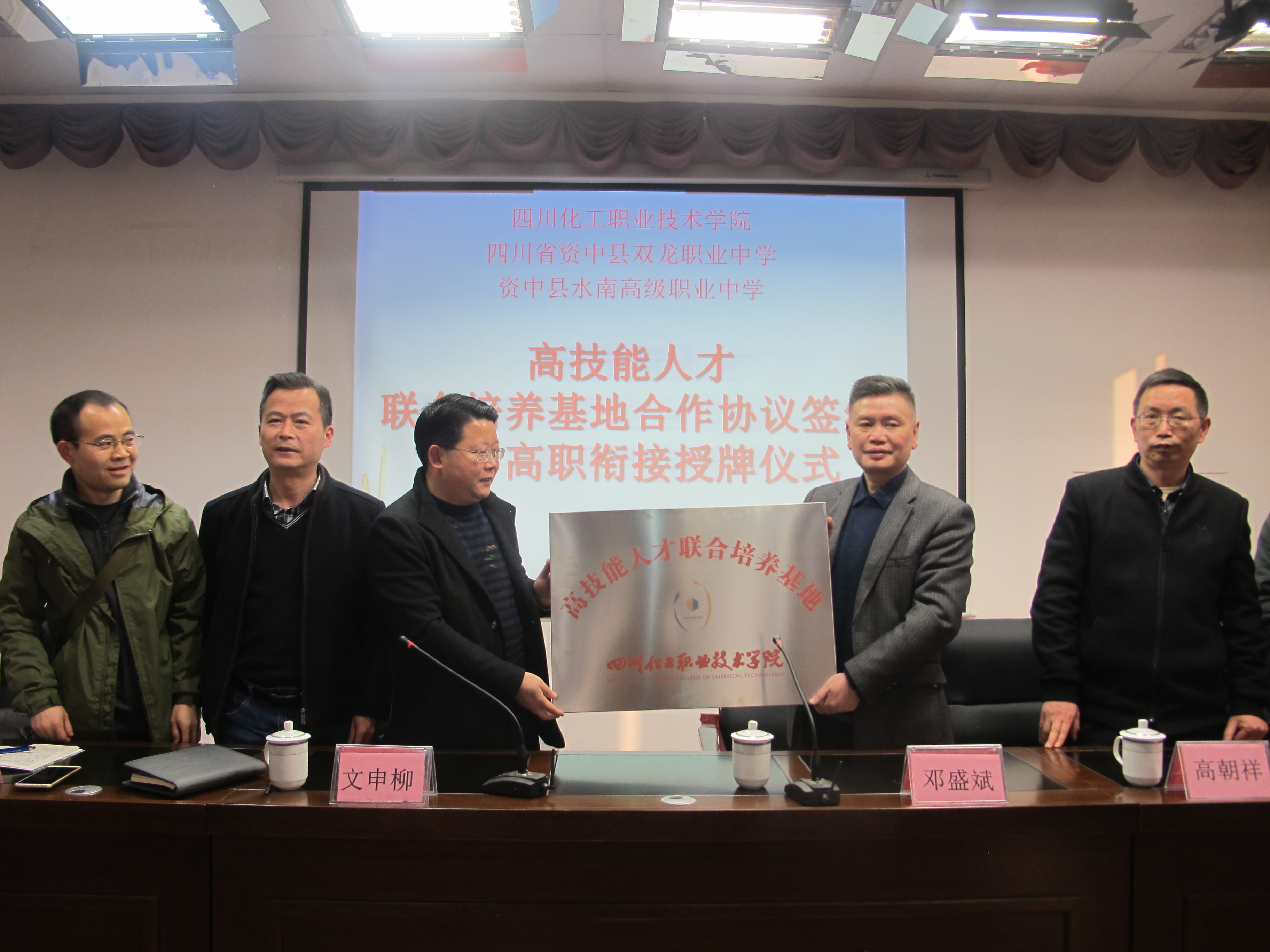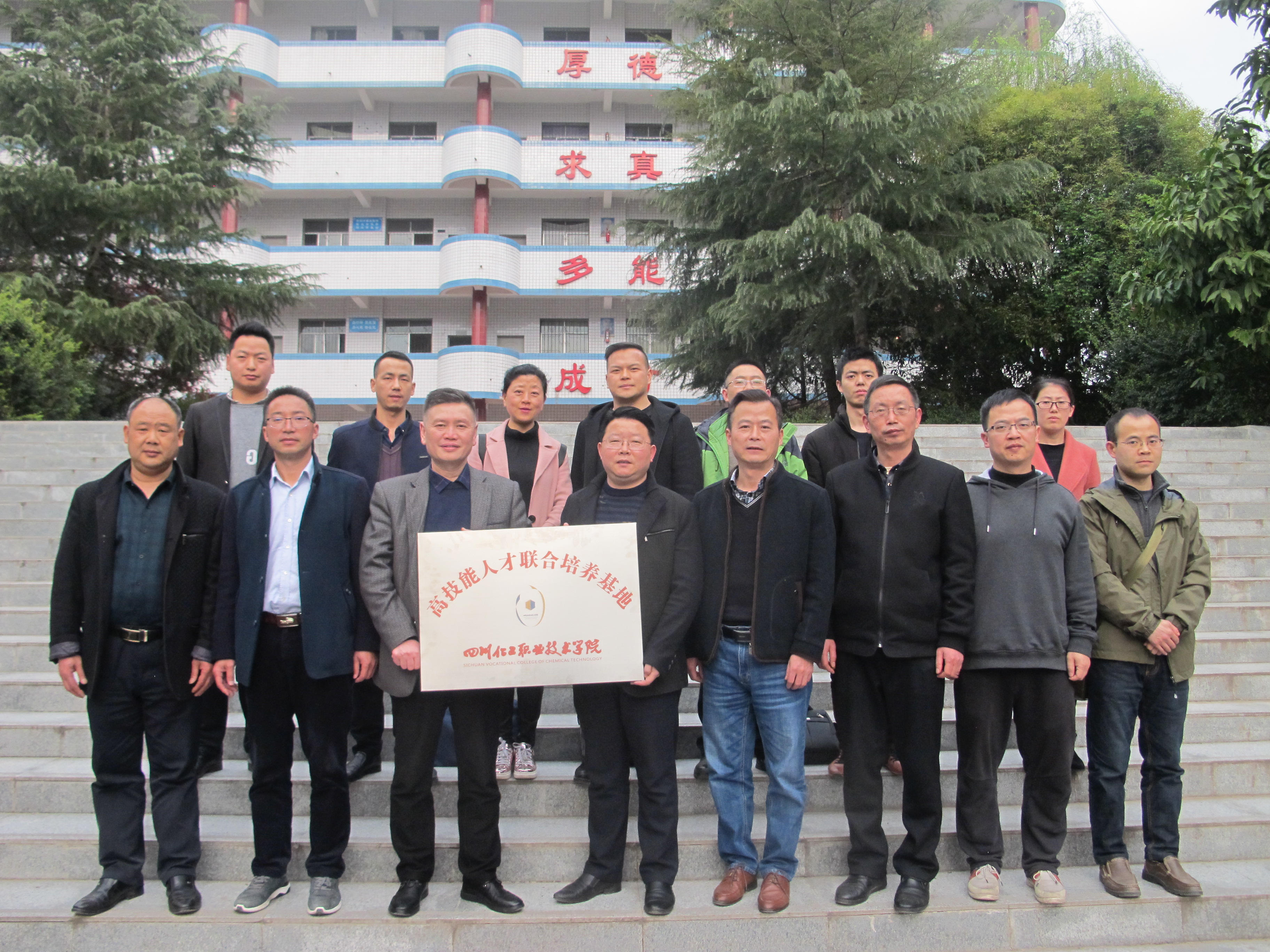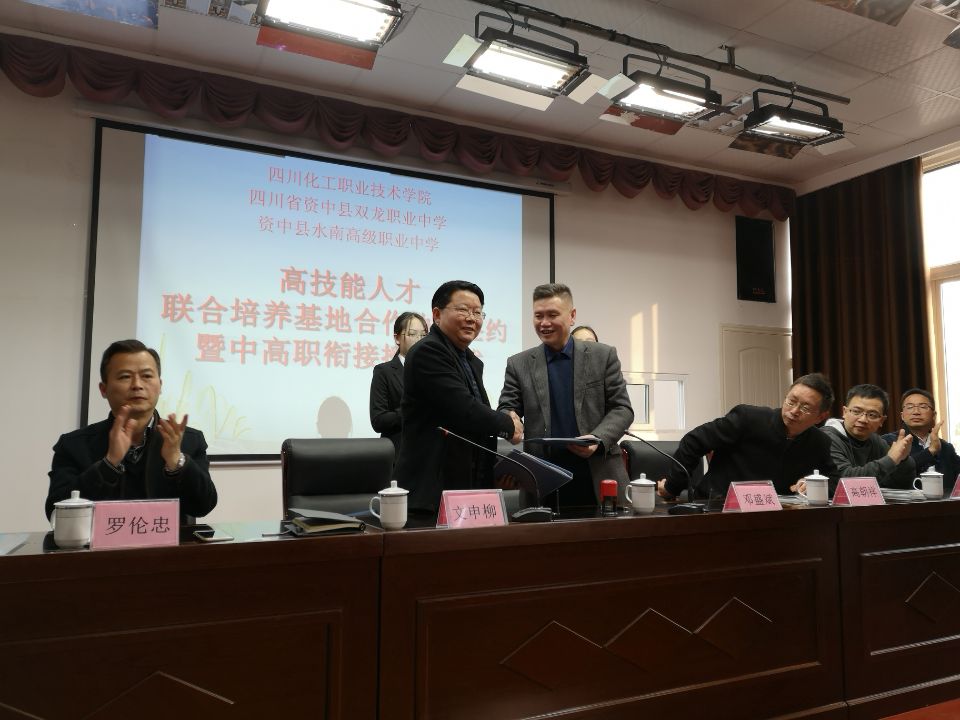 随后,在200余名师生见证下,文院长和邓盛斌校长共同签署了四川化院——资中职校《高技能人才联合培养基地》协议书;签约仪式后文院长将“高技能人才联合培养基地”牌匾授予资中职校邓盛斌校长。